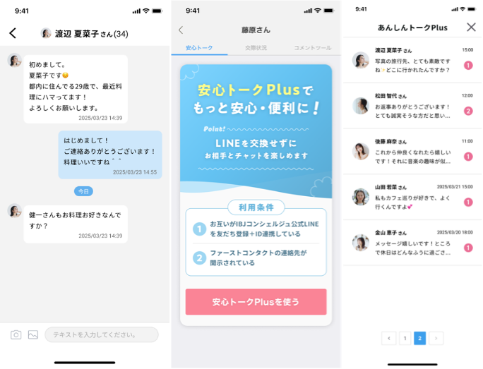 交際中は、LINEなどの個人連絡先を交換することなく「安心トーク」でやり取りができるため、プライバシーや安全面でもご安心いただけます。